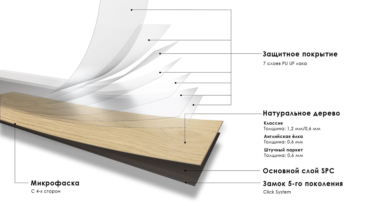 Слитые воедино основу из камня и слой дерева сверху покрывают 7 слоями защитного лака — это надёжная защита от внешних воздействий.